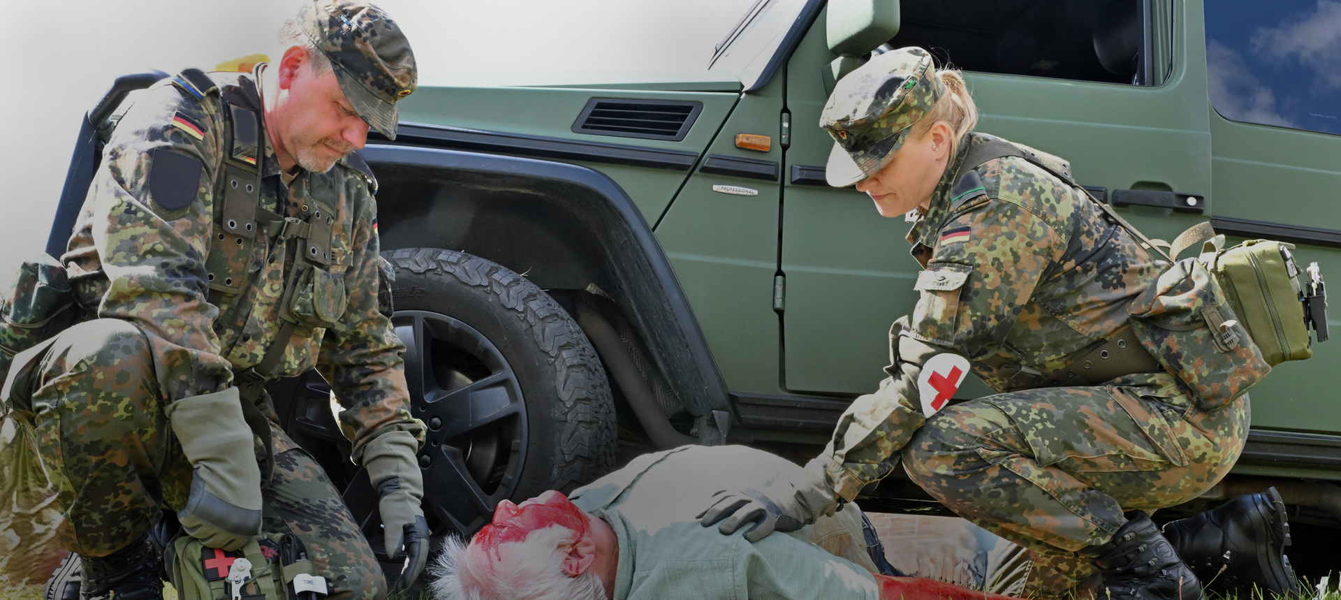 Eine schwere Blutung (z.B. mit Tourniquet) sollte umgehend versorgt werden.